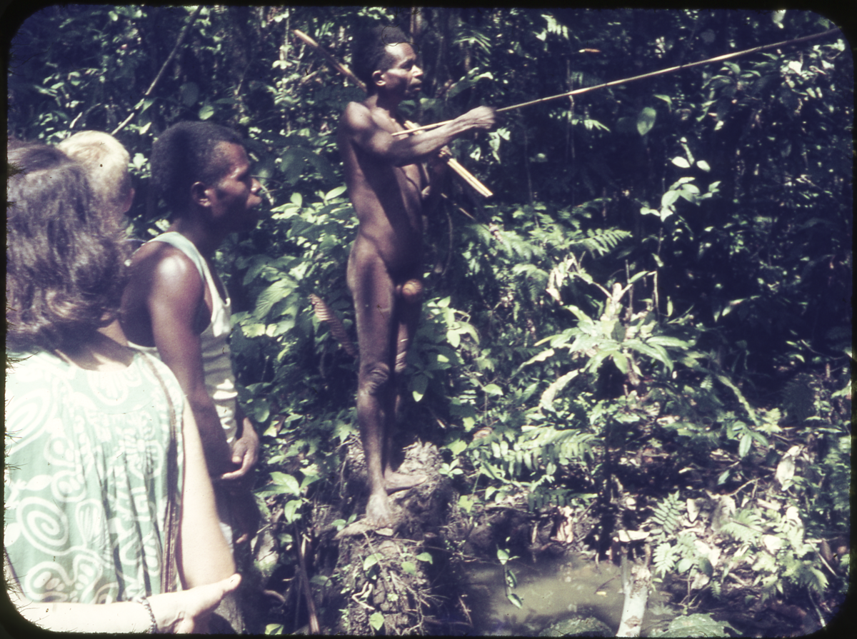 The other man, wearing a penis gourd, is holding onto his bow and arrow and his shoving his arrow into something across the small stream below him. [Andrew Moutu 24/02/04]