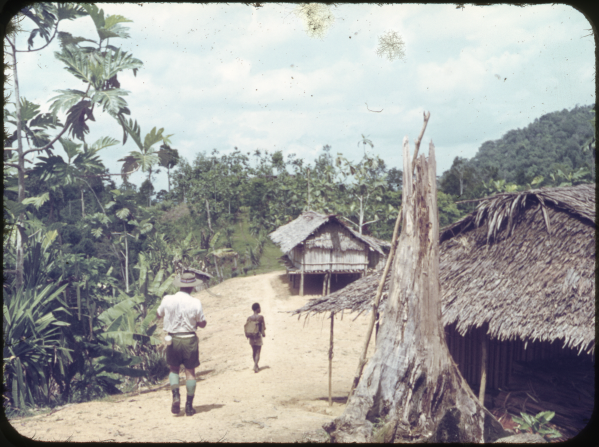 A European man, ?Joe Stewart, following a local guide who is also carrying Stewart’s bag. The two men are passing through a village plaza. The village is neat and tidy and is located on a ridge-top surrounded by a handful of breadfruit trees. Stewart wears heavy walking boots, knee-high green socks and dark green shorts, a white shirt and a wide-brimmed hat. He carries a ?water bottle in his belt. Inscriptions on the slide show that this photograph was taken in Akrani village. If there is pronunciation problems, then the same village could also be Wakrani village, located to the east of Amanab, West Sepik (Sandaun) Province. [Andrew Moutu 24/02/04]