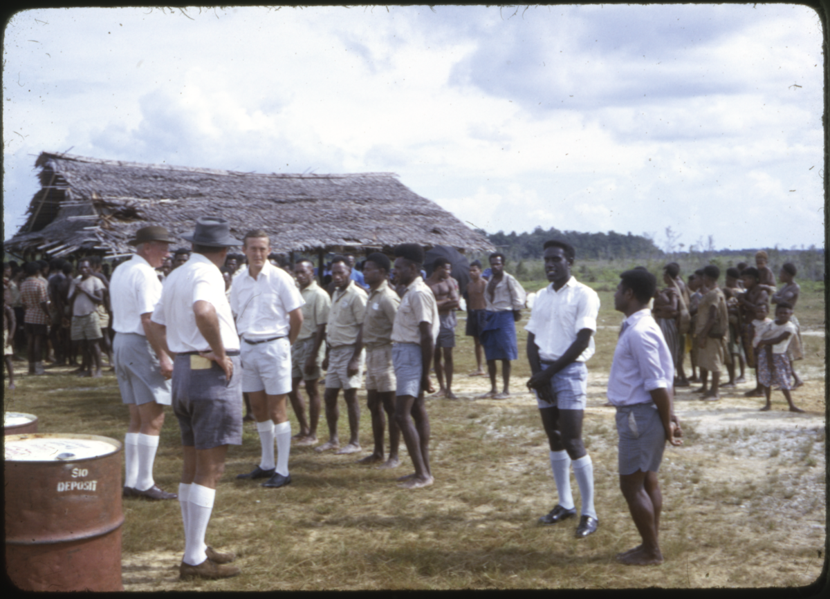 McCarthy is being introduced to the village councillors by Plummer. The inscription on the slide states that the other European man is De Clency, who must have come with McCarthy in the same plane. A crowd of local people have gathered on this occasion. [Andrew Moutu 25/02/04]