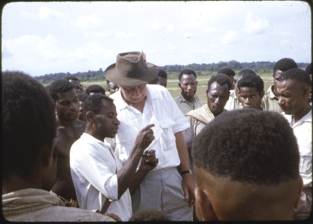 One of the village councillors reading a letter to McCarthy, probably petitioning Mr McCarthy over some concerns the villagers may have. A large group of local men have gathered to watch. [Andrew Moutu 25/02/04]