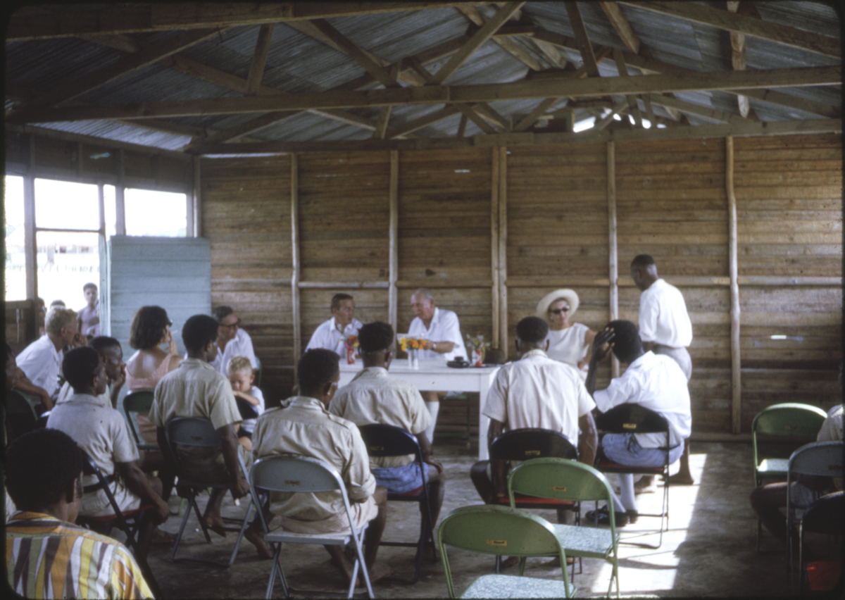 A meeting taking place within a large wooden schoolhouse in Green River Station. Seated at a table at one end of the room are (left to right) AC Plummer, JK McCarthy and an unidentified European woman) wearing a wide-brimmed sun hat and sunglasses. She is ?speaking to a local man standing in front of her. Another European man [?Clancy] is sitting to the left of the table. On the table are three flower arrangements, placed in cans [including a Coke can], and a camera. Rows of metal folding chairs are arranged in front of the table. Dorothy Graham is sitting in the front row, smoking a cigarette, while Timothy plays on the seat beside her. Another blonde-haired European man is sitting to her left. Local men in uniform are sitting in the other seats. A group of local people is watching from outside [Mark Elliott 10/03/04]