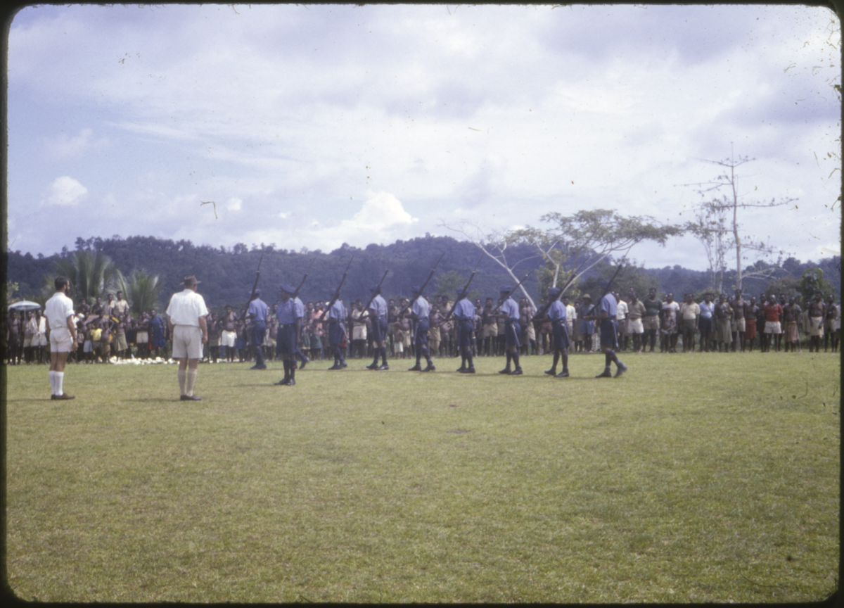 McCarthy inspecting police at Nuku. The police have taken up their rifles and begun to fall out to their left. [Mark Elliott, 10/03/04]
