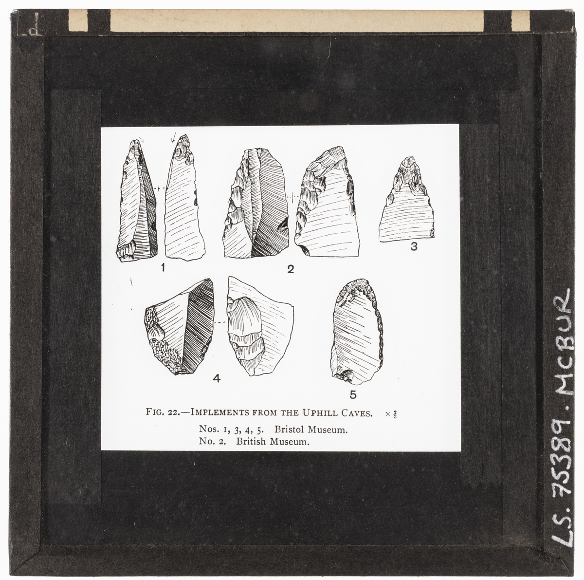 Documentary drawing of five Paleolithic stone tools excavated from Uphill Caves. [JD 10/01/2026]