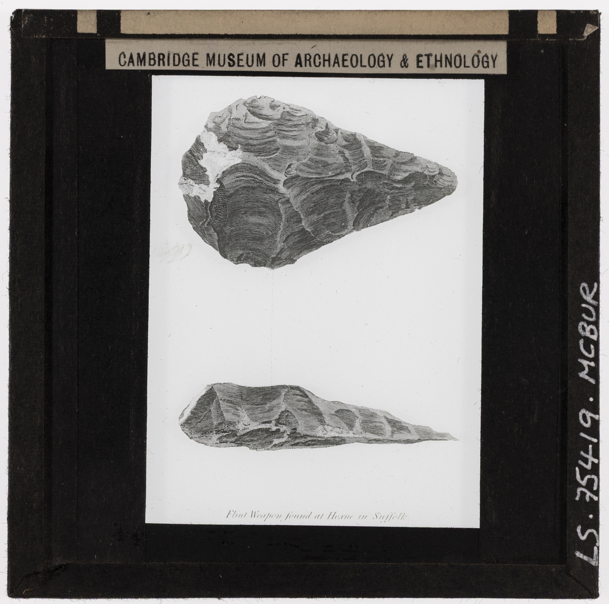 Top and side drawings of a "Flint Weapon found at Hoxne in Suffolk." [JD 12/01/2026]