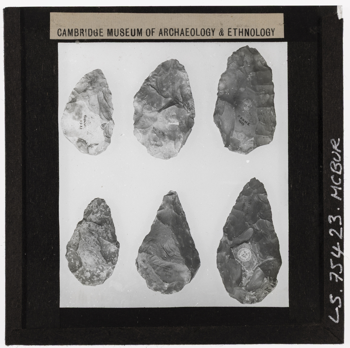 Documentary photograph of six hand axes from Hoxne. One of the hand axes has a label of the Norwich Castle Museum adhered to it. [JD 12/01/2026]