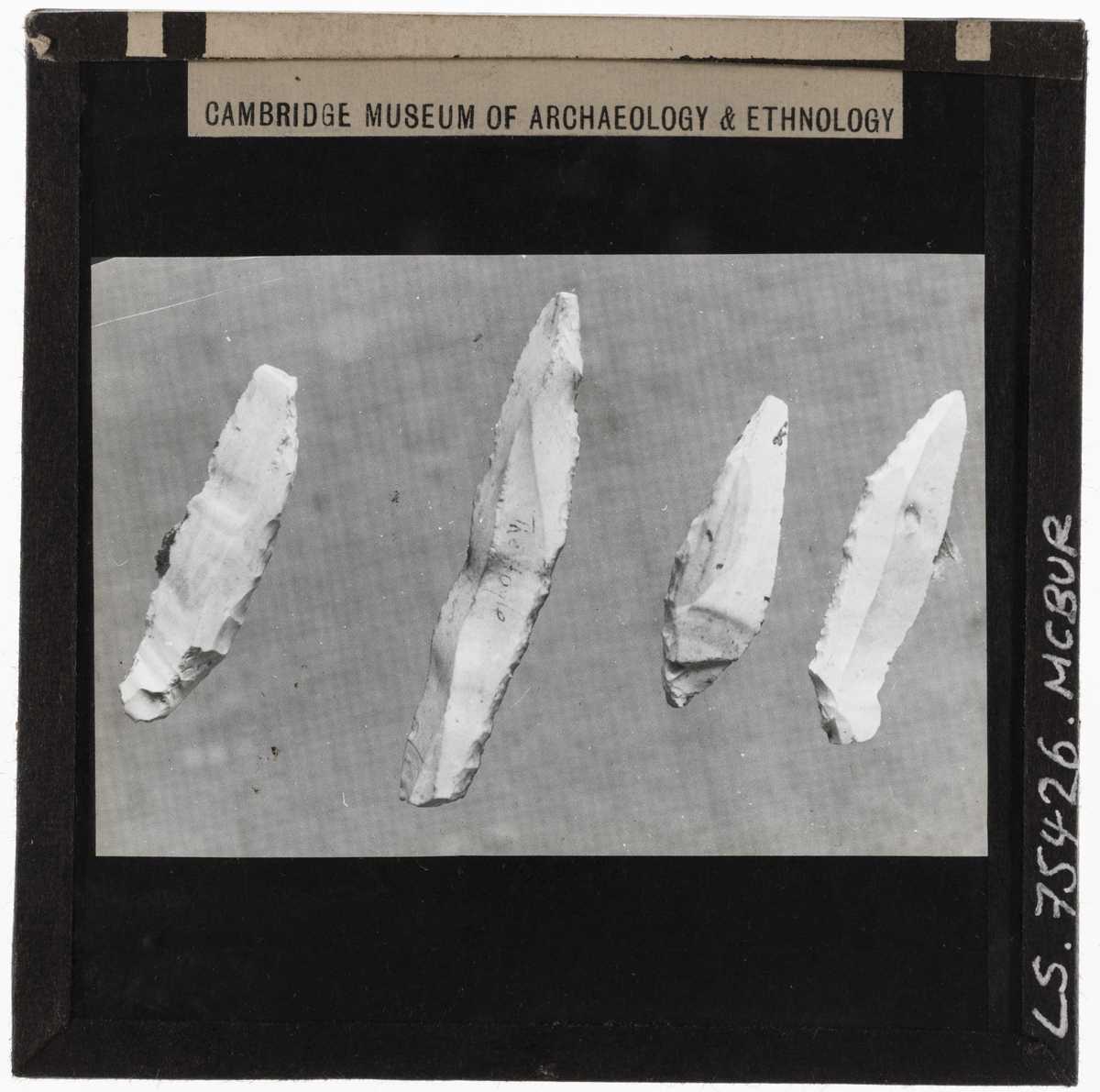 Documentary photograph of four Neolithic worked stone tools, probably found at Hoyle's Mouth or Little Hoyle, two caves in Pembrokeshire. McBurney conducted excavations at Little Hoyle in 1958. [JD 12/01/2026]