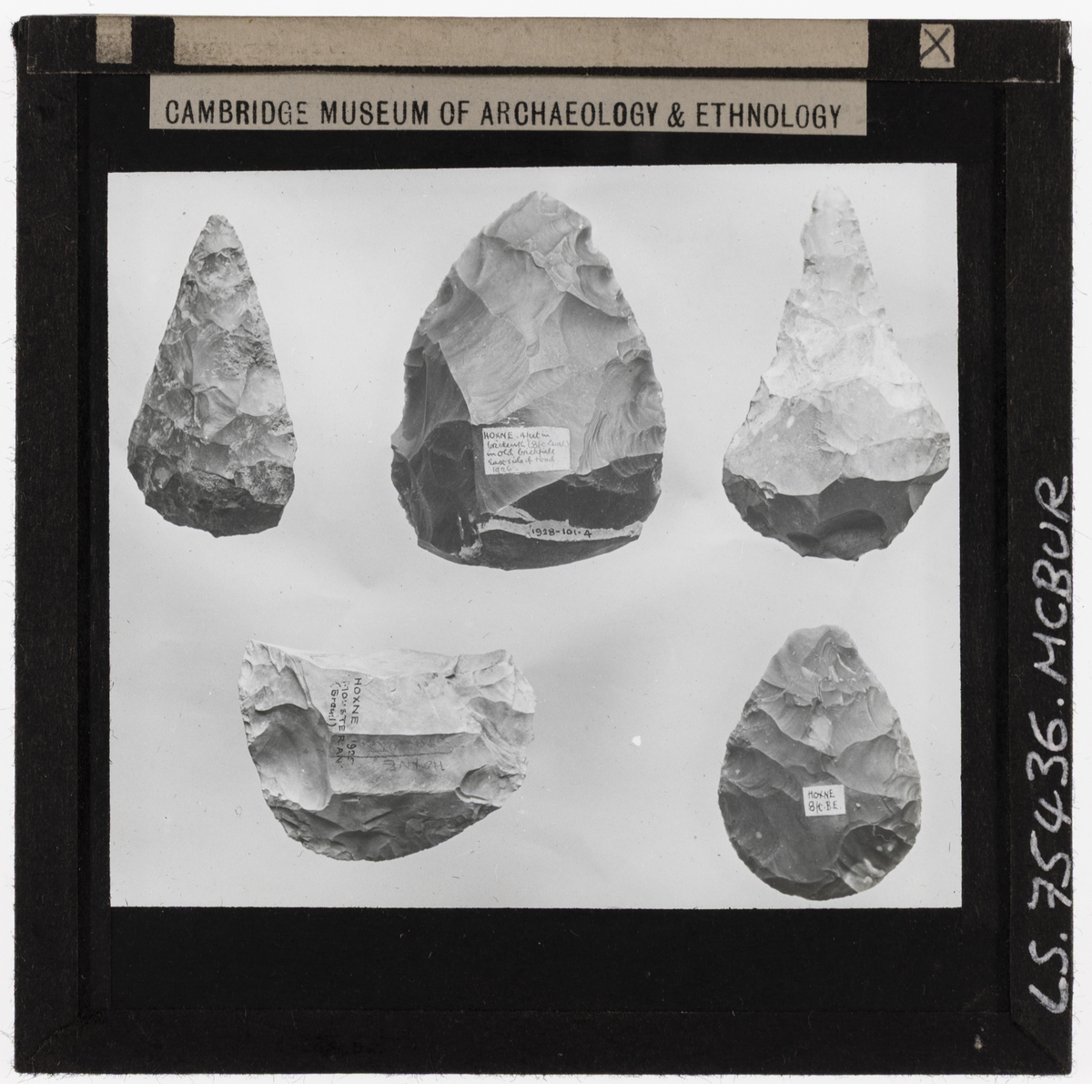 Documentary photograph of five worked stone tools from Hoxne. [JD 12/01/2026]