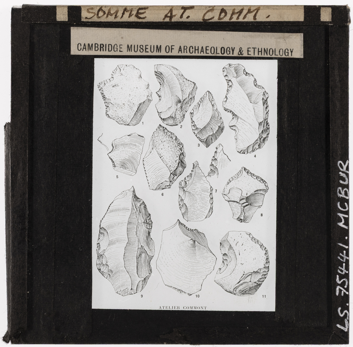 Documentary drawing of eleven Paleolithic stone tools, likely Acheulean or Levallois artefacts, from the Atelier Commont in the Somme region. [JD 10/01/2026]