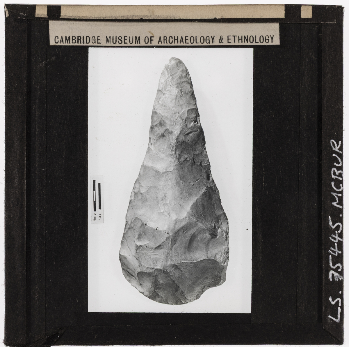 Documentary photograph of a large, teardrop-shaped Palaeolithic flint handaxe from Hoxne.