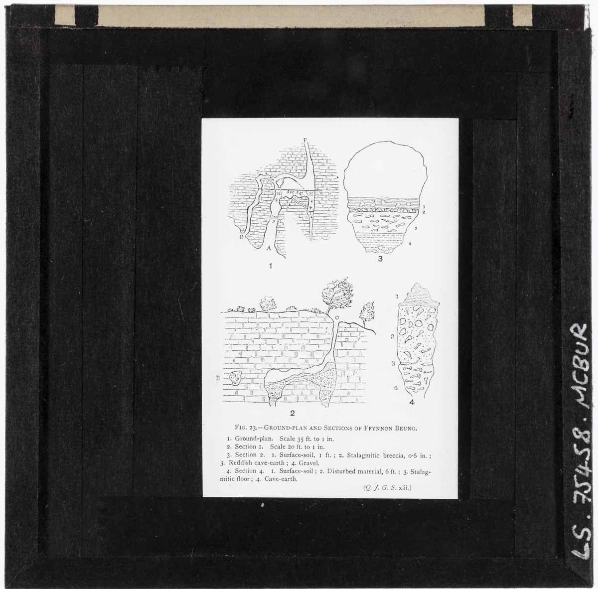 4. Section 4. 1. Surface-soil; 2. Disturbed material, 6 ft.; 3. Stalagmitic floor; 4. Cave-earth.