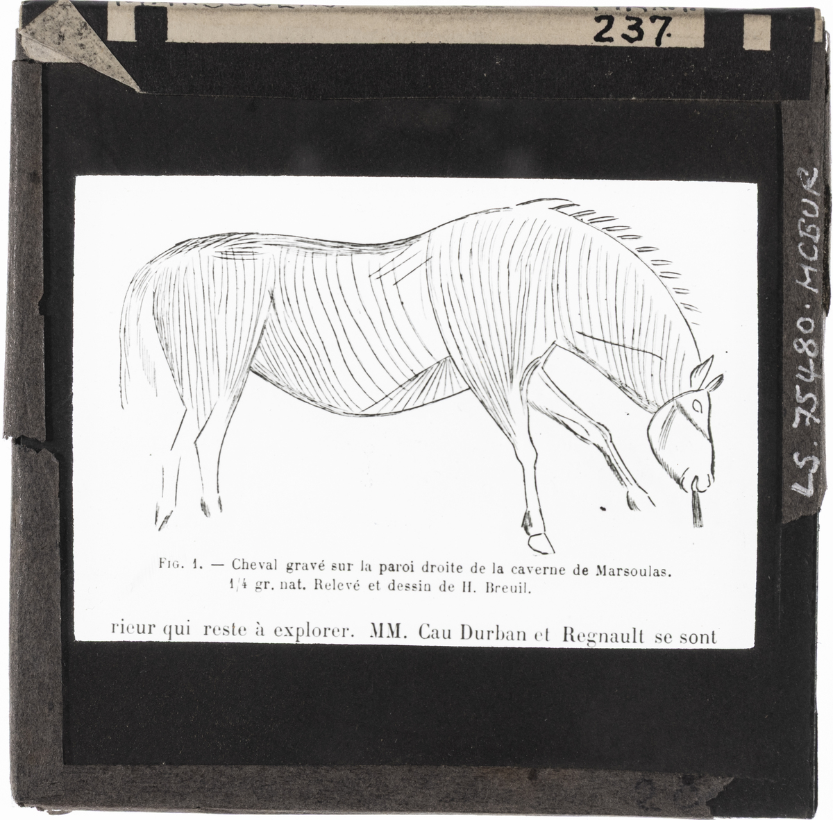 A drawing by H. Breuil of a Paleolithic horse engraving found on the right wall of the Marsoulas cave in Haute-Garonne, France. [JD 21/01/2026]