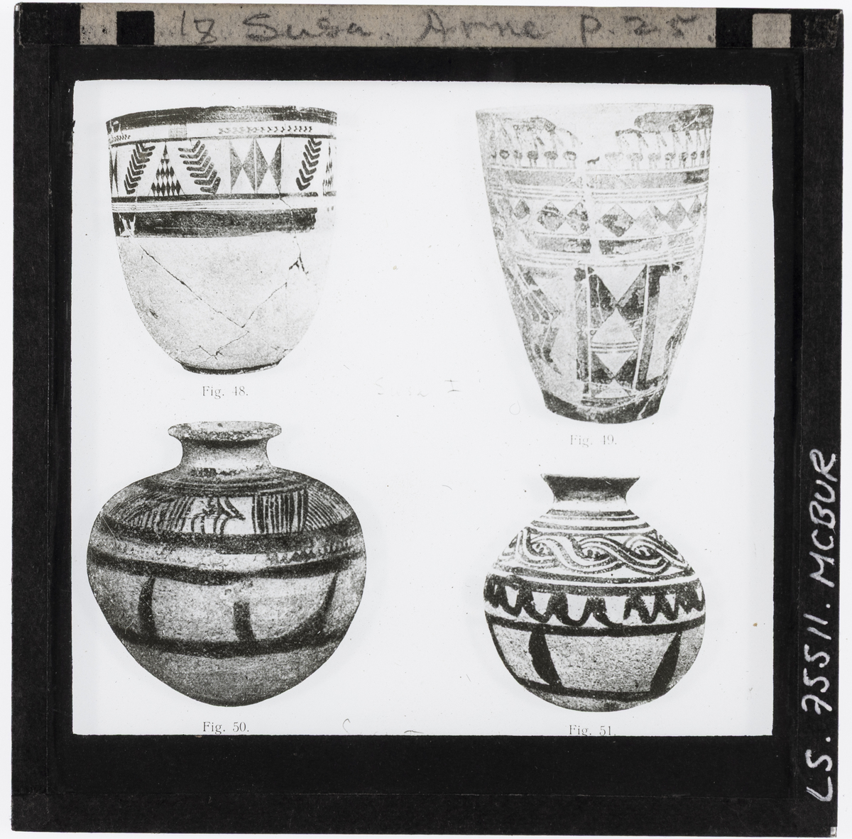 Documentary photograph of four pottery vessels with painted designs from Susa of the Chalcolithic period (mid-4th millennium B.C.).  [JD 24/01/2026]