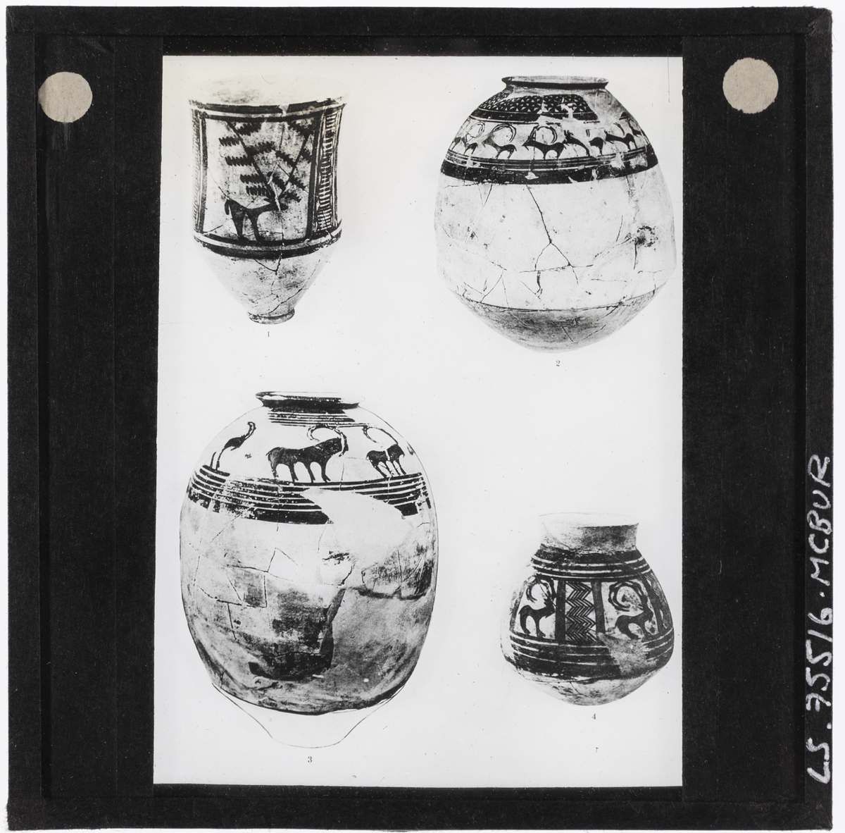 Documentary photograph of four pottery vessels decorated with animal designs from Tepe Siyalk, Iran. [JD 24/01/2026]