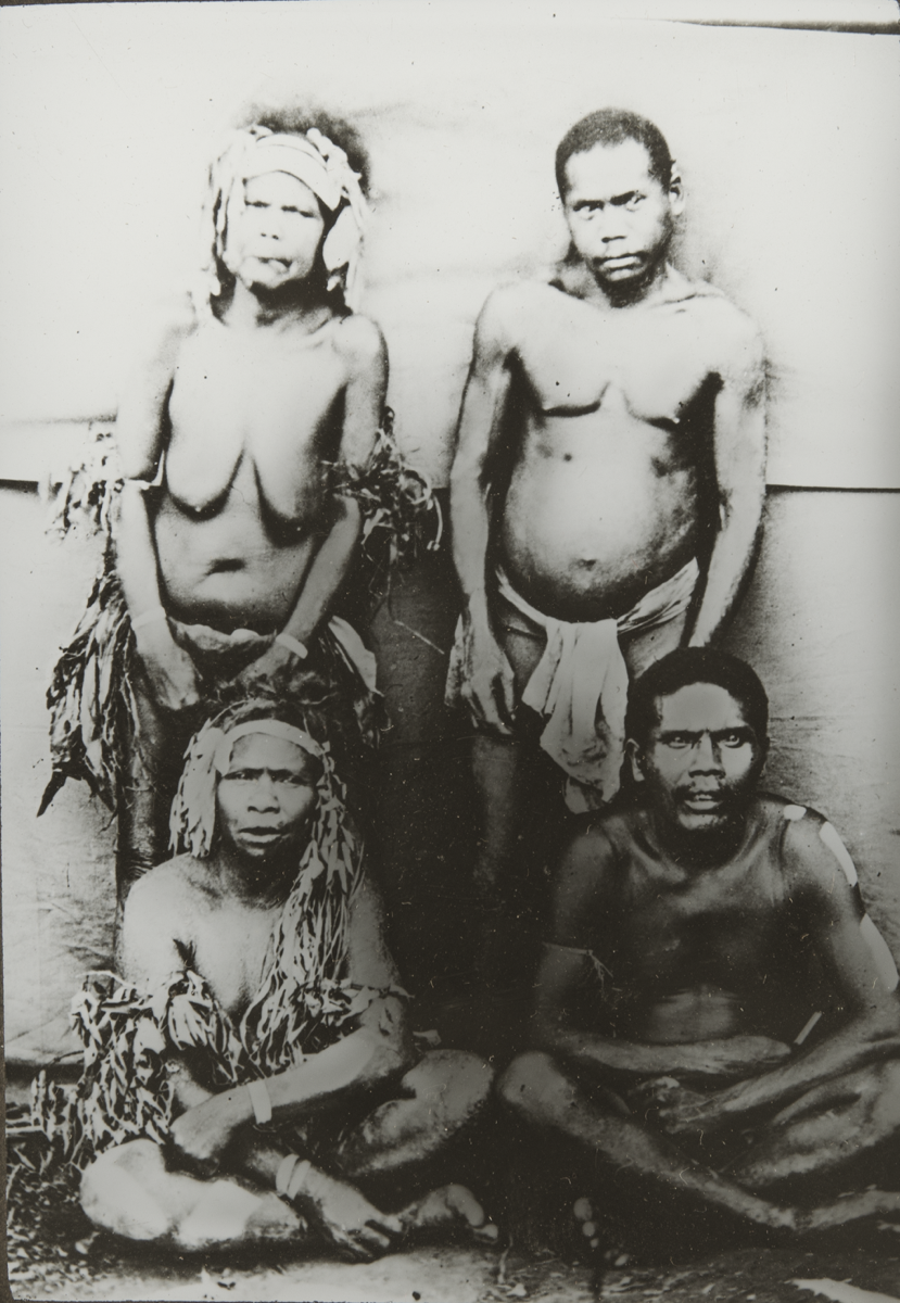 Portrait of four Orang Asli people. One man and one woman are standing, the other man and woman sitting cross-legged on the ground in front. The women wear skirts, leaf headdresses and leaf arm-bands; the men wear loincloths.