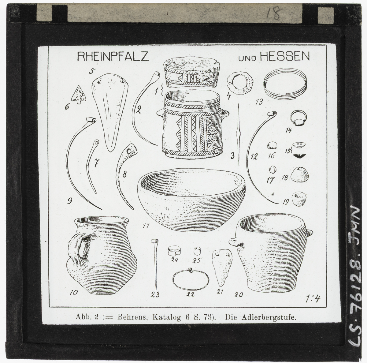 Documentary drawing of twenty pottery and tools associated with the 'Adlerbergstufe' (Adlerberg phase/culture) in the regions of the Rhenish Palatinate (Rheinpfalz) and Hesse (Hessen).  [JD 25/01/2026]