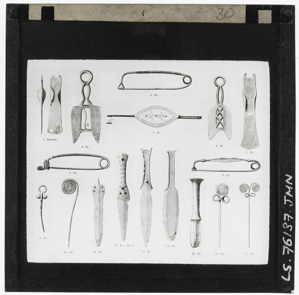 Documentary drawing of seventeen Bronze Age items, including daggers, fibulae brooches, and decorative pins. [JD 26/01/2026]