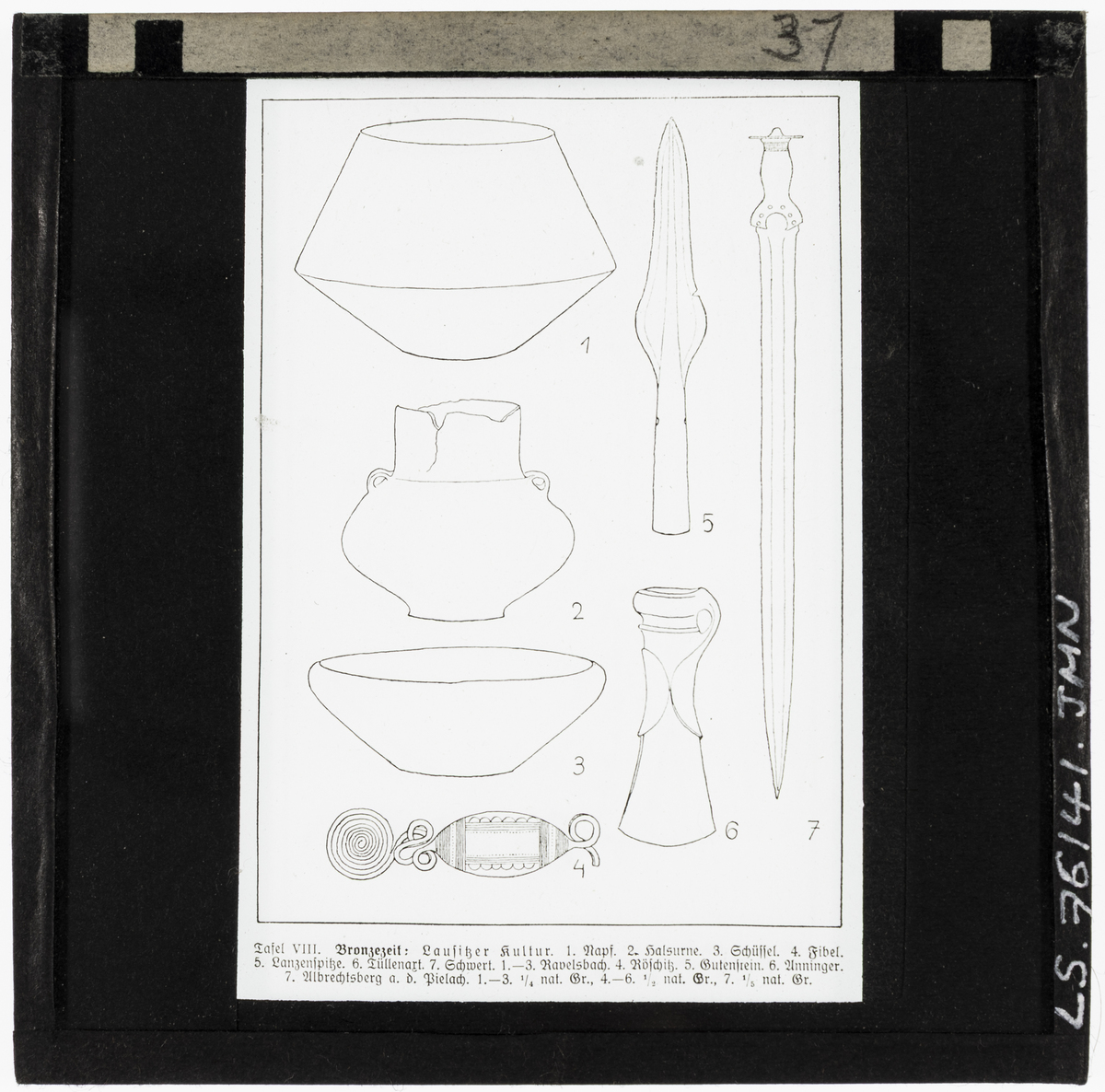 Documentary drawing of "Bronze Age: Lusatian Culture. 1. Bowl. 2. Neck urn. 3. Scoop. 4. Fibula. 5. Spearhead. 6. Socketed type. 7. Sword. 1-3. Ravelsbach. 4. Röschih. 5. Guteniein. 6. Anninger. 7. Albrechtsberg on the Bielach. 1-3. 1/4 natural size, 4-6. 1/2 natural size, 7. 1/5 natural size."