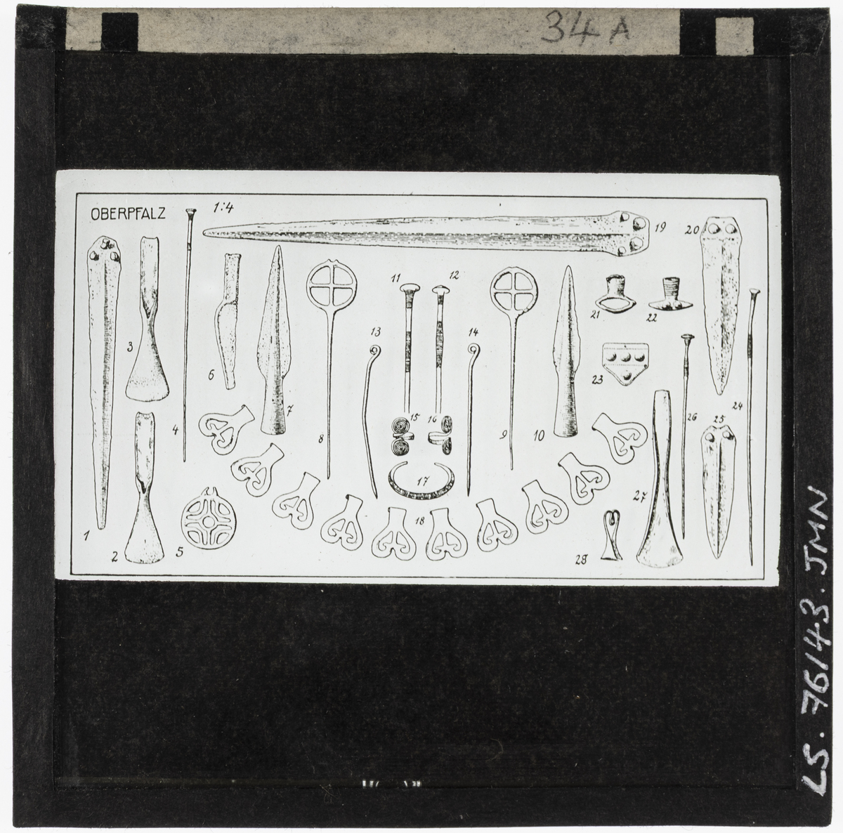 Documentary drawing of twenty-four Bronze Age artefacts, including daggers, spearheads, pins, bracelets, and fibulae (clasps), from Oberpfalz. [JD 26/01/2026]