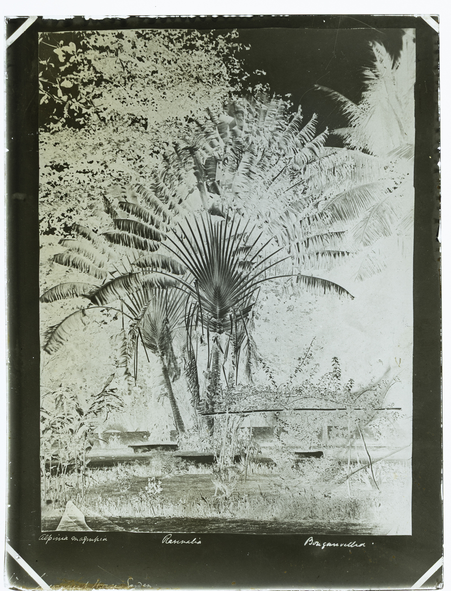On Catalogue Card for duplicate print P.9741.ACH1: Traveller’s palm, Bougainevillea [sic Bouganville]