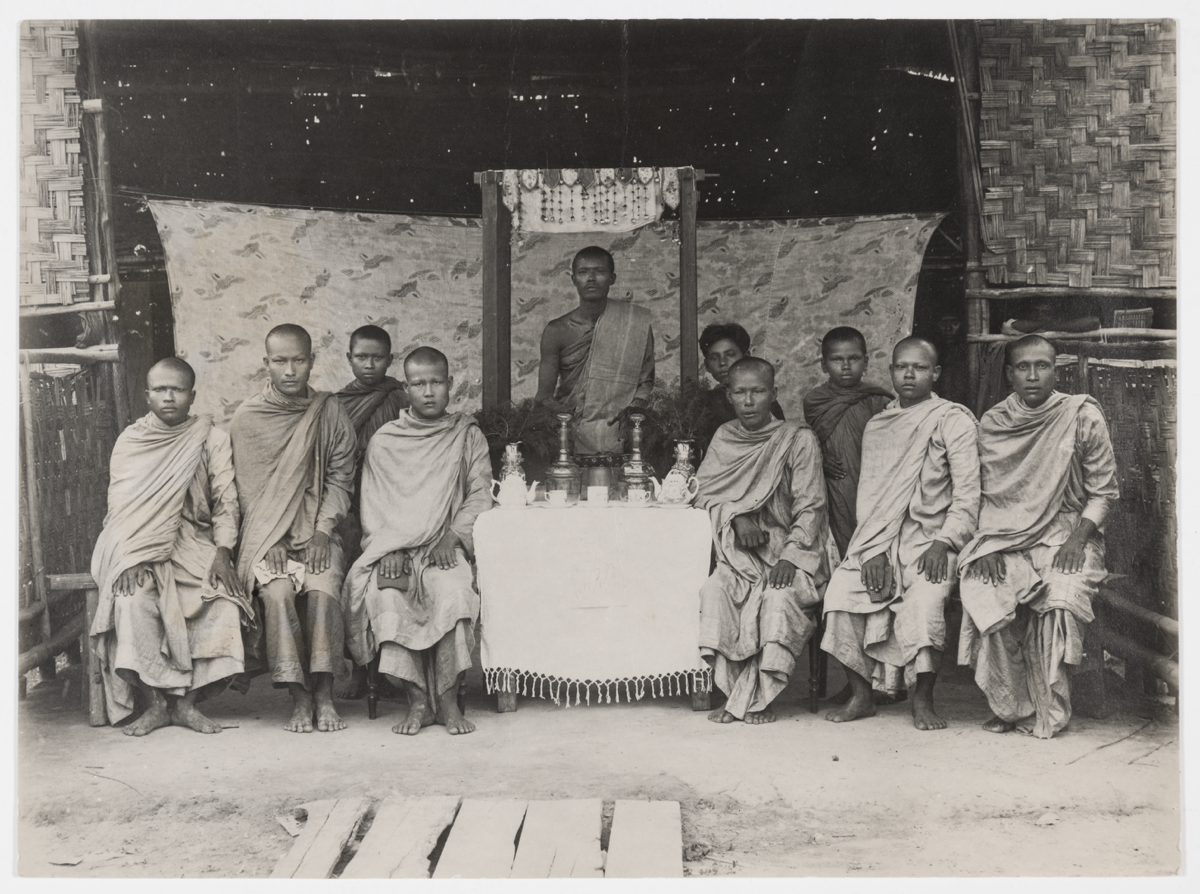Group portrait of robed monks seated on either side of an offering table.