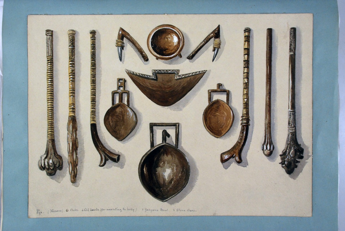 “Fiji (Nasova). 6 Clubs, 4 Oil Bowls (for annoiting the body) 1 Yangona Bowl, 2 Stone Axes.” [Gordon Cumming’s annotation, JD 6/1/2012]