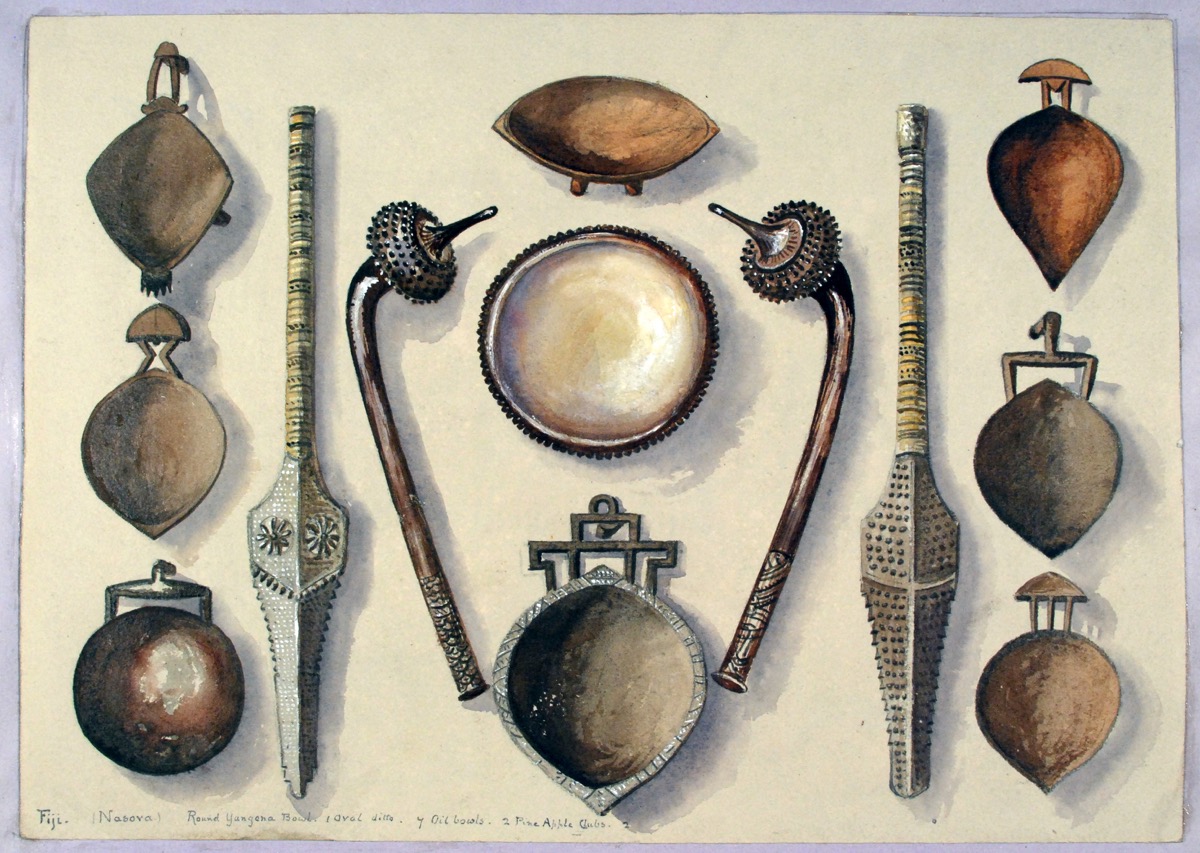 “Fiji (Nasova). Round Yangona Bowl, 1 oval ditto. 7 Oil bowls. 2 Pine Apple Clubs.” [Gordon Cumming’s annotation, JD 6/1/2012]