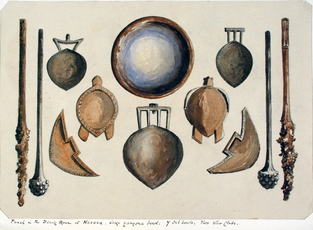 “Panel in the Dining Room at Nasova. Large yangona bowl. 7 Oil bowls. Two War Clubs.” [Gordon Cumming’s annotation, JD 6/1/2012]