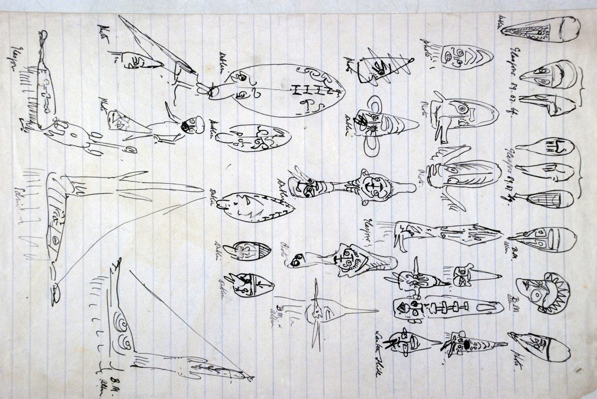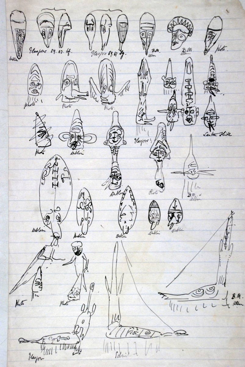 Page of sketches of masks and figures from the Papuan Gulf. [JD 9/23/2014]