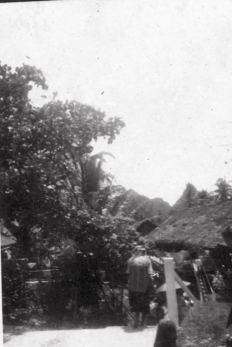 Below them can be seen the sloping thatched attap roof of the longhouse on the right, the bamboo slatted tanju (open gallery) with lines of washing hanging out to dry, and a man ascending a ladder consisting of notches made in a single piece of wood.