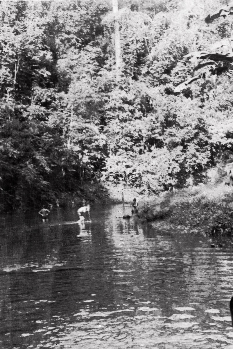 A group of about eight men, women and children stand in a still, clear river at the base of a mountain, bathing, washing, and probably playing in the waters. On the right is a grassy bank. Along the opposite bank is the steep jungle-covered cliff-face. [LC 28/8/2007]