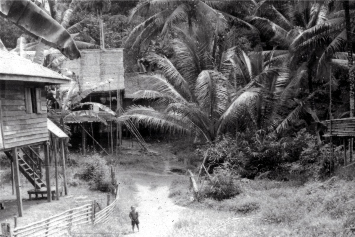 A boy stands on a footpath running through various raised buildings in the village. On the right, behind a clump of large palm trees, can be seen part of a raised drying platform with low wooden railings. On the left are a raised building with wooden plank walls and a sloping ?zinc roof, with a sturdy plank wooden ladder leading up to it. Further down is probably one end of the longhouse, with a raised bamboo platform, communal tanju (open gallery) and sloping thatched attap roof, with a thin wooden notch ladder leading up to it.