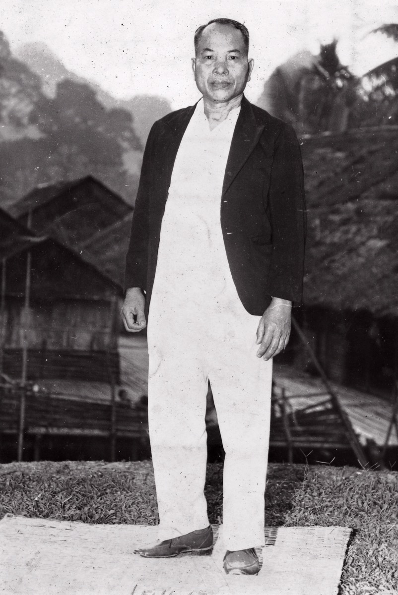 Portrait of Otor anak Sunjam, standing on a kasah (rattan and bark mat) on the hill in front of his house, overlooking the longhouse at Kampung Benuk. He wears a shirt, trousers, dark blazer and shoes.