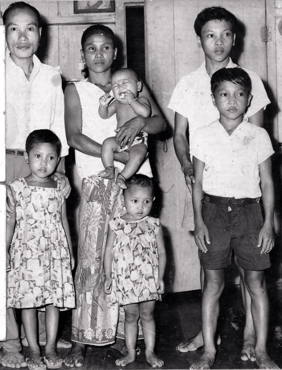 A group portrait of Paka anak Otor and his family, standing in their wooden house in Kampung Benuk. Back row (left to right): Paka anak Otor, wearing a long-sleeved shirt and trousers; his wife Sajir anak Sepen, wearing a sleeveless blouse and patterned sarong and carrying their youngest son, Kenid; their son Mihan anak Paka, wearing a short-sleeved shirt and shorts. Their children in the front row (left to right): Kena anak Paka, wearing a patterned sun-dress; Bungit anak Paka, wearing the same; Nabon anak Paka, wearing a short-sleeved shirt and shorts.