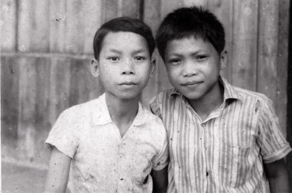 Two boys, Srekot (left) and Nabon anak Paka (right), pose for the camera in front of a wooden plank wall. Both wear short-sleeved shirts.