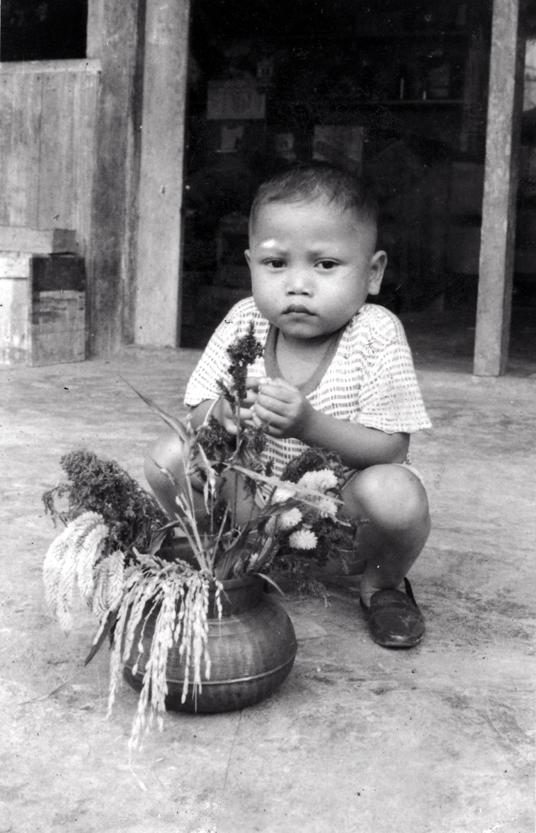 A young boy wearing a striped tee-shirt, shorts and shoes, possibly Kenid anak Paka, squats on the cement porch in front of his grandfather Otor anak Sunjam’s provision shop on the ground floor of their family home. He is grasps some dried flowers and rice stalks spilling out of a globular ?ceramic jar in front of him.