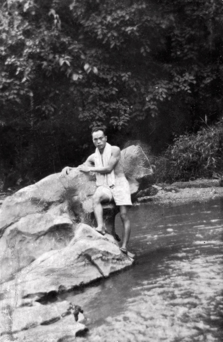 Paka anak Otor stands on a rock formation in the middle of a shallow river, posing for the camera. He wears a pair of shorts and a towel around his neck.