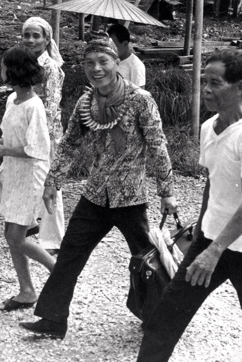 Context: Kampung Benuk has been a small-scale tourist attraction since the 1960s, being particularly famous for its longhouse. Its first visitors were often members of the British, Australian and American armed forces stationed nearby during the Confrontation years between Indonesia and Malaysia (1963-1966); later visitors included civilian tourists, foreign dignitaries, UNESCO representatives, film crews, and government officials. Paka and his family often played host to these visitors, performing adat gawai-based dances and rituals for their entertainment. According to Paka’s family, this photograph may have been taken during the filming of a documentary on adat gawai in Kampung Benuk.