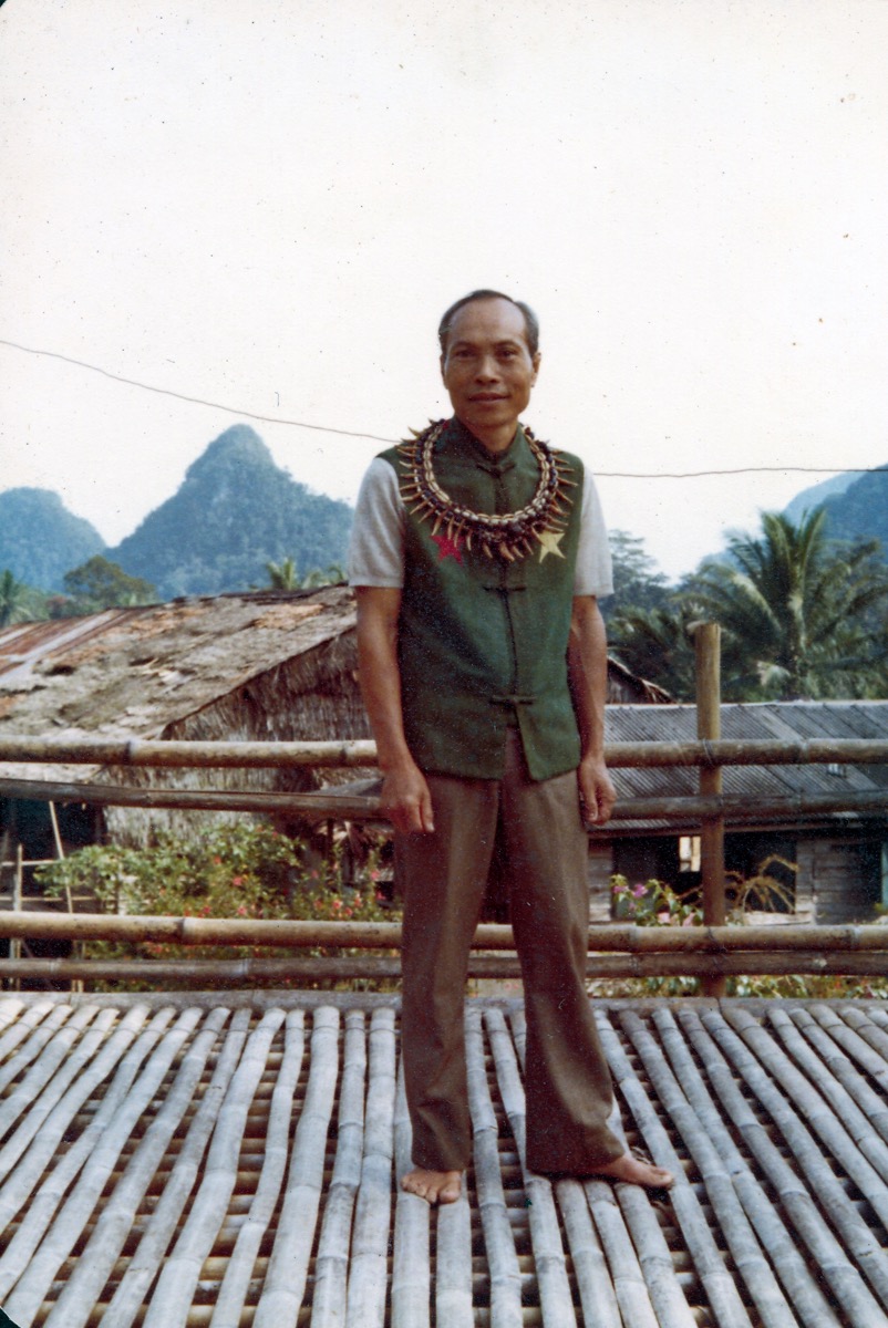 Paka anak Otor, dressed in his green tua gawai (ritual head) vest with two stars woven onto it, a stagan (leopard teeth necklace). tee-shirt and trousers, stands on a raised bamboo slat drying platform (tanju) just outside his house, overlooking the longhouse at Kampung Benuk. A thin wire, probably a washing line, is suspended behind him.