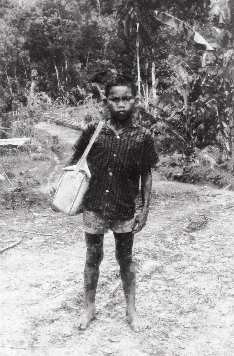Miko anak Paka, wearing a check shirt and shorts, and carrying a white satchel, stands in a clearing, probably on the outskirts of Kampung Benuk. Behind him is a path leading to the villagers’ farms and gardens, flanked by two enclosed gardens on either side. To the right is a clump of banana trees.