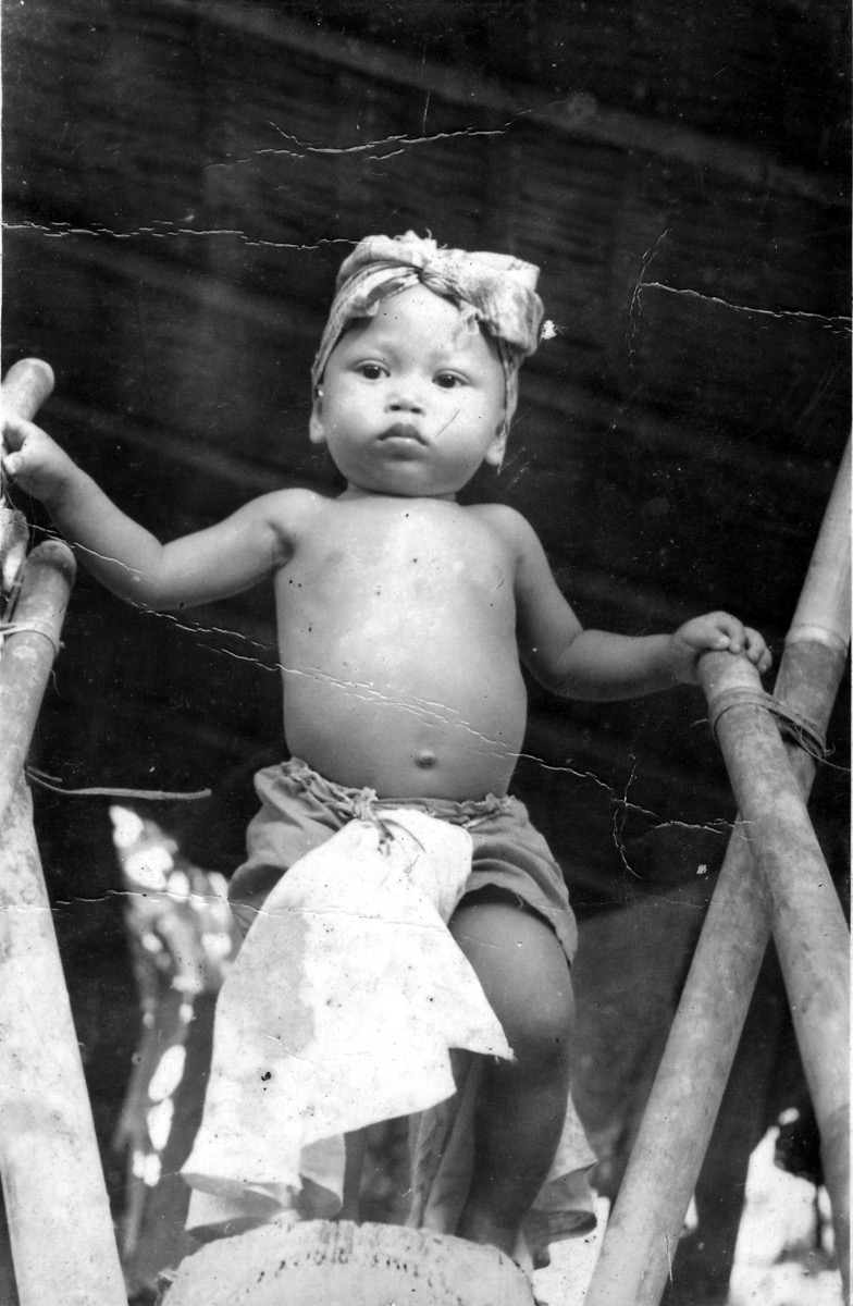 Toddler Kenid anak Paka, wearing a headscarf and shorts with a white cloth tied to them, stands at the top of a ladder consisting of notches cut into a single wooden pole, gripping the bamboo handrails on either side.