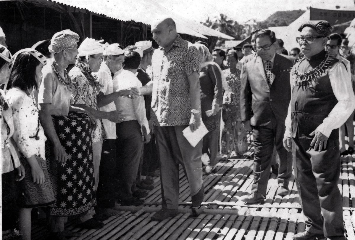 A tall man in a patterned shirt and trousers, possibly the Sultan of Pahang, Abu Bakar (1932-1974) walks down the bamboo slat tanju (open gallery) of the longhouse at Kampung Benuk, shaking hands with men and women lining his route. On the right is his host, Otor anak Sunjam, dressed in his tua gawai (ritual chief) outfit of a headscarf, stagan (leopard teeth necklace), vest with stars sewn onto it, shirt and trousers. An entourage of men in suits follows behind.