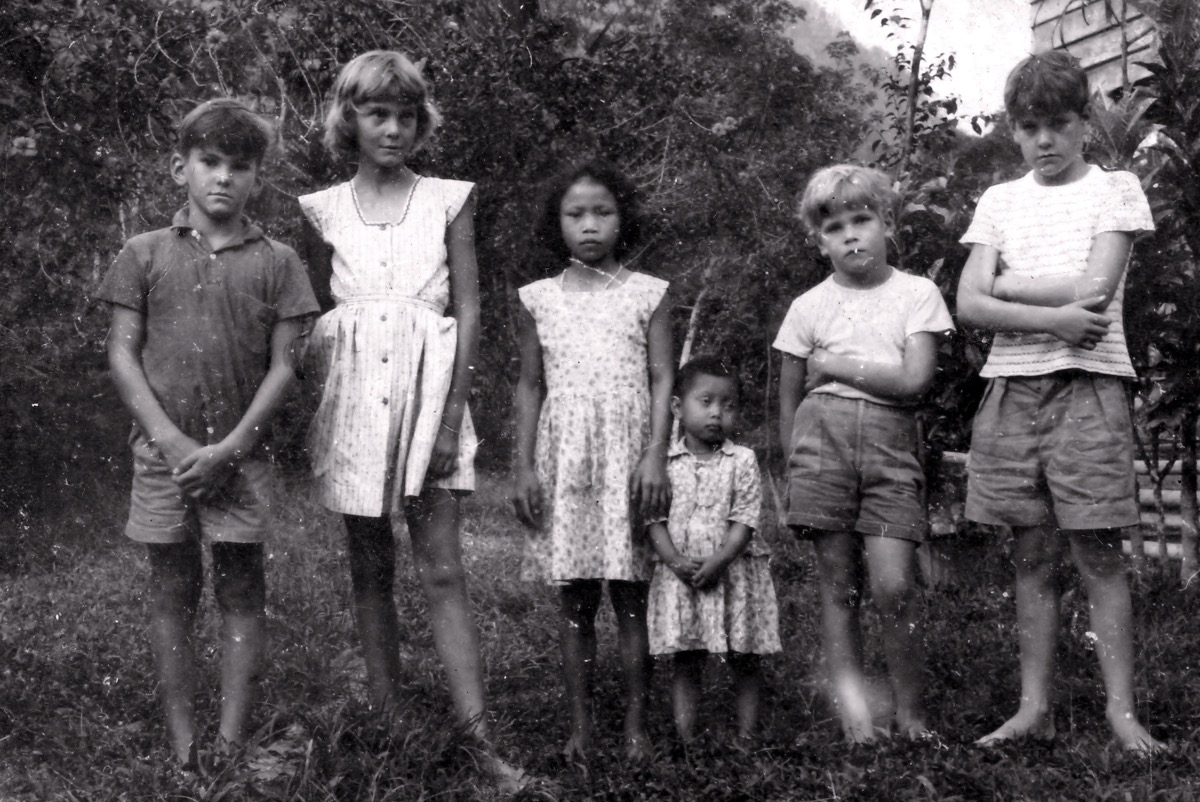 Three ?European boys and one girl stand in the garden of Paka anak Otor’s house, posing for the camera with two of Paka’s daughters, Simau and Kena. Simau and Kena stand in the middle of the group, wearing short patterned dresses.