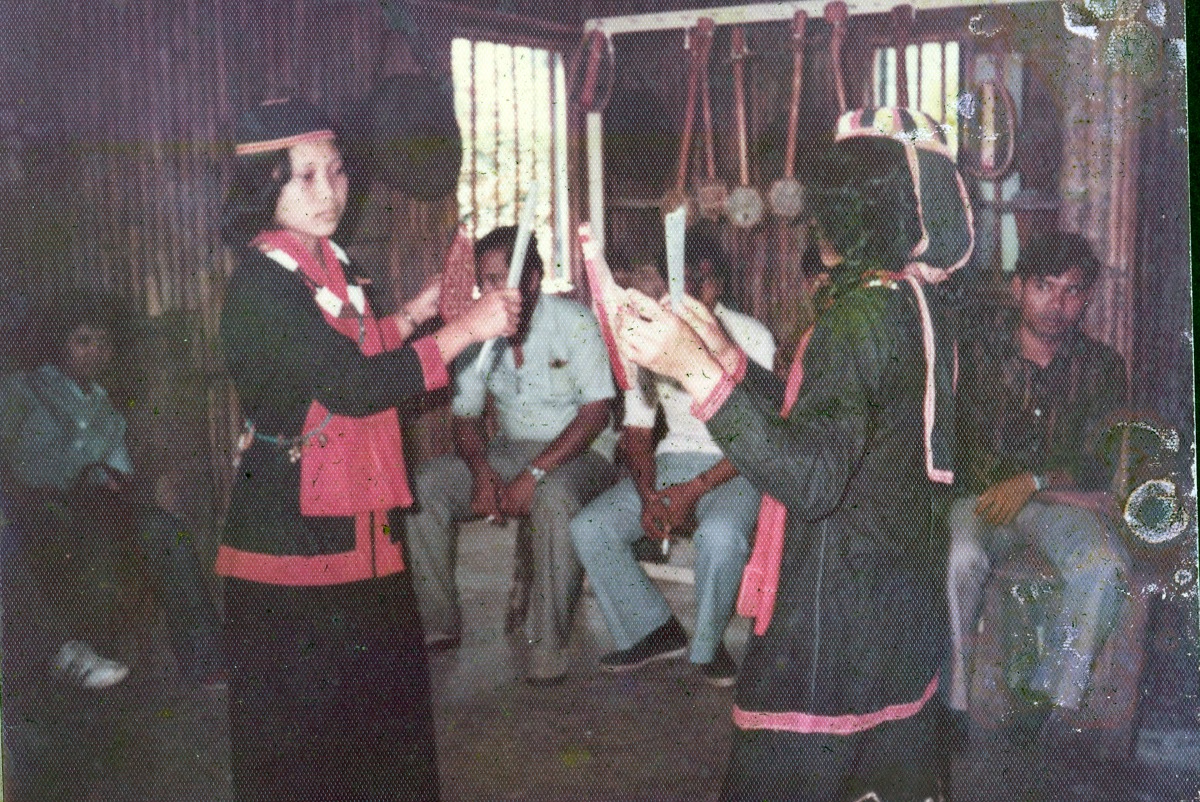 Two young women, both wearing adat gawai (pre-Christian rituals) clothing consisting of sepiya (round cloth caps with back flaps), dark jackets and skirts, sashes and stagi (elliptical bead necklaces), perform the jekau dance with miniature pendat (blades with V-shaped incisions on the tip) and nengin (decorated shields) in Paka anak Otor’s mini-museum.