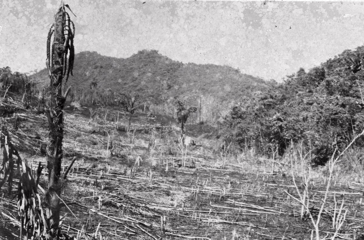 View of a hill slope recently cleared and burned in preparation for planting. It is covered in stumps and woody debris, and dotted with small trees. In the background and to the right are other mountain slopes covered in thick jungle.