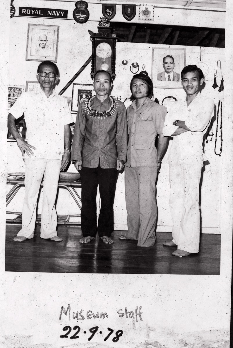 A Polaroid photograph of Paka anak Otor flanked by three men, probably members of the Sarawak Museum staff. Paka wears a long-sleeved shirt and trousers and a stagi (round leopard teeth necklace); the other men wear short-sleeved shirts and trousers.