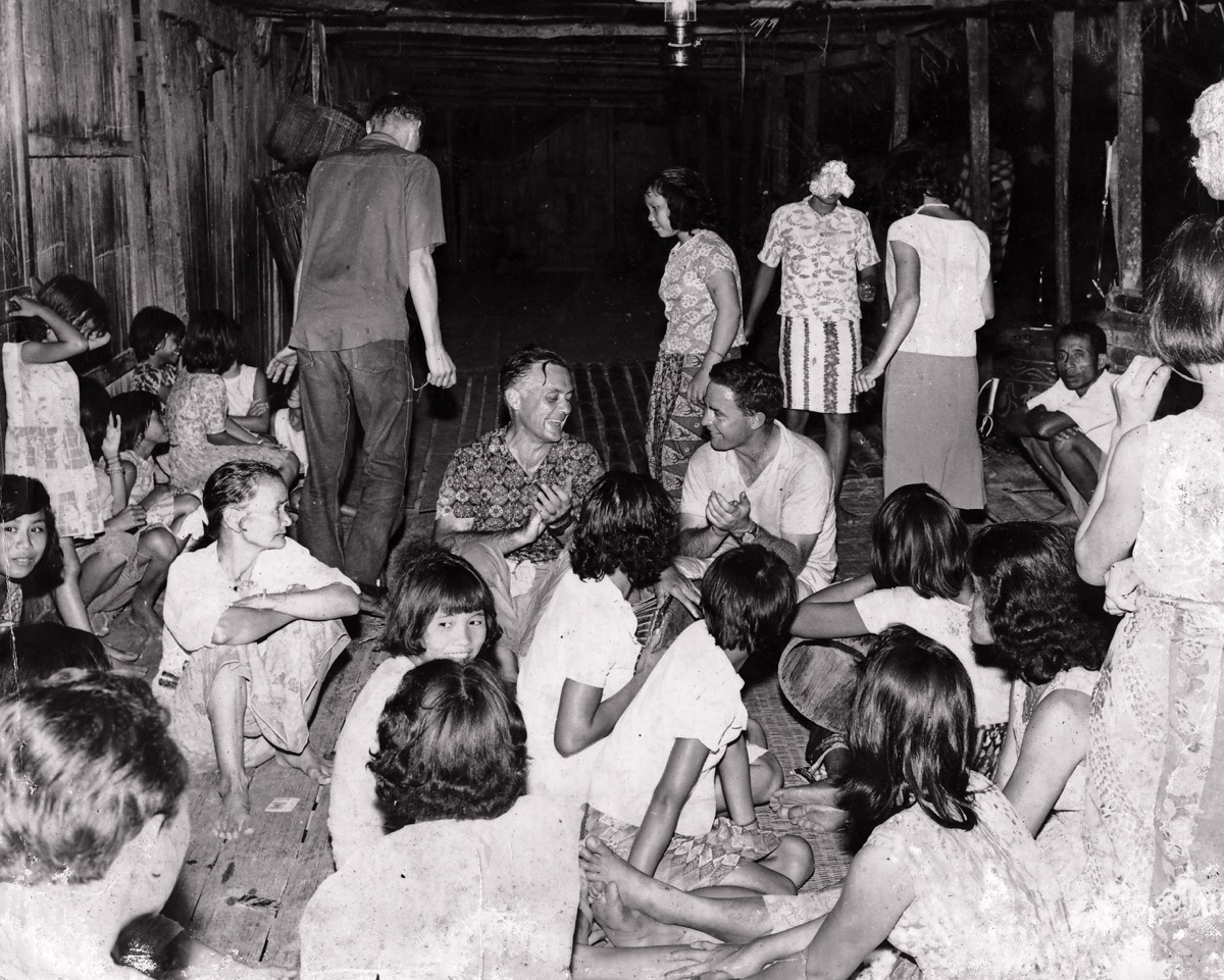 Two male ?European visitors, possibly from the British Navy, sit in the awah (covered verandah) at Kampung Benuk’s longhouse, possibly clapping along to some music. They are surrounded by a large group of villagers, including Sumuk Nuong (wife of Otor anak Sunjam) sitting on the left, and Sikas, the man sitting against a pillar on the right.
