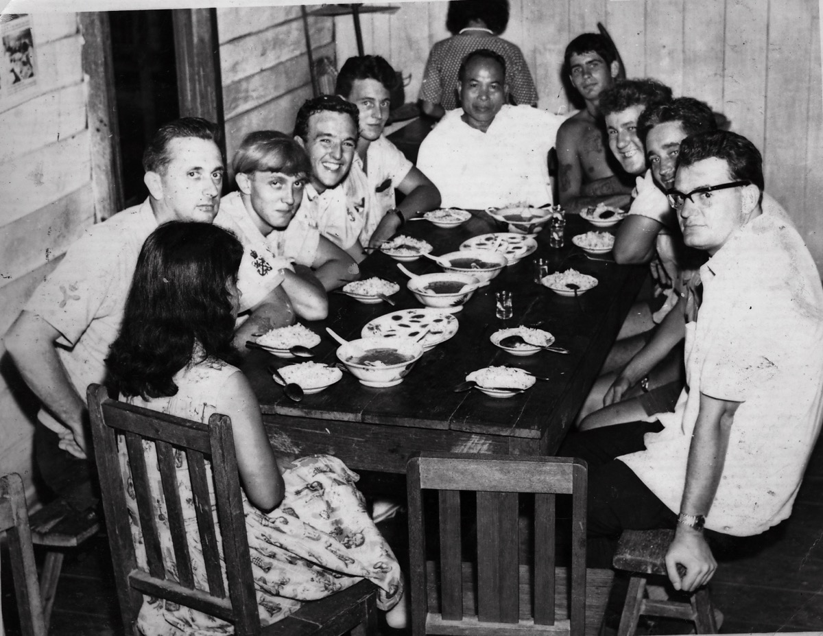 A group of eight male visitors from the British Navy sit around a meal laid out on a rectangular wooden table in Otor anak Sunjam’s house, posing for the camera. They mostly wear shirts and shorts. The man on the left wears a naval uniform shirt with a Petty Officer badge on its sleeve. At the head of the table is Otor, also wearing a shirt; at the other end, with her back to the camera, is Sajir anak Sepen, his son Paka’s wife, wearing a patterned dress.