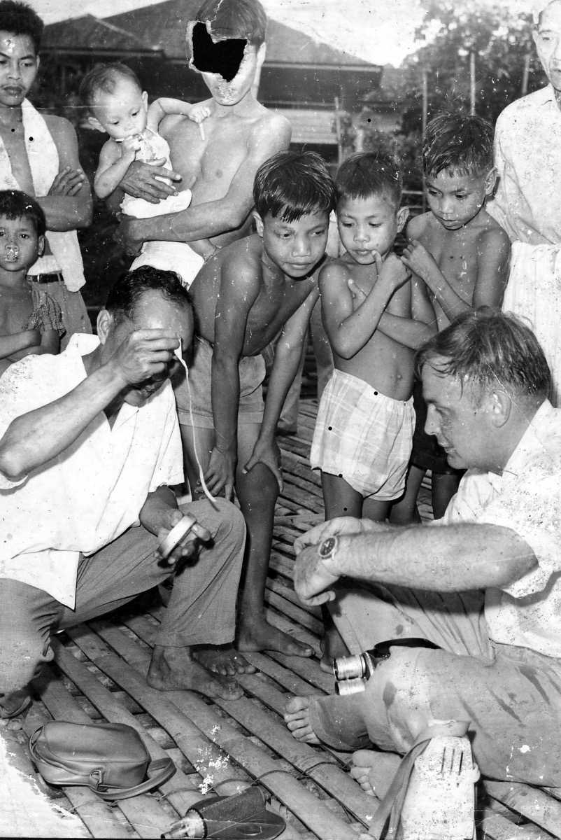 Paka anak Otor and Mike, a visitor from the British Navy, sit on the tanju (open gallery) of the longhouse at Kampung Benuk, possibly loading a camera in preparation for its use. Paka holds up a thin strip of ?tape in one hand and a roll in the other; Mike holds a ?camera on the floor between his ankles. A group of eight boys and men hover above them, watching. From left to right behind Paka and Mike: Ringon (man), Bisop (boy), Apog carrying Jockey, Mitod, Kunyud, Nipi, Babai Nasia.