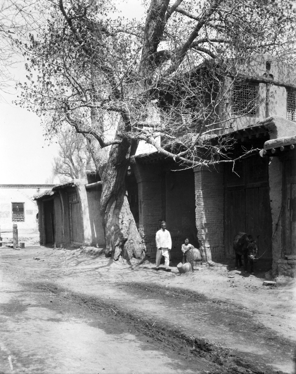 Ching Ho [Jinhhe [sic? ?Jinhe]] street; man standing in front of a building; large tree.