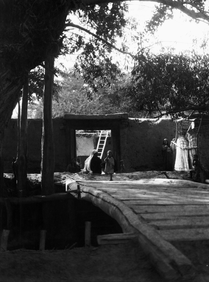 (Qarghaliq) Kargalik [Yecheng] Old Woman and Child at bridge; wall and ladder in background.